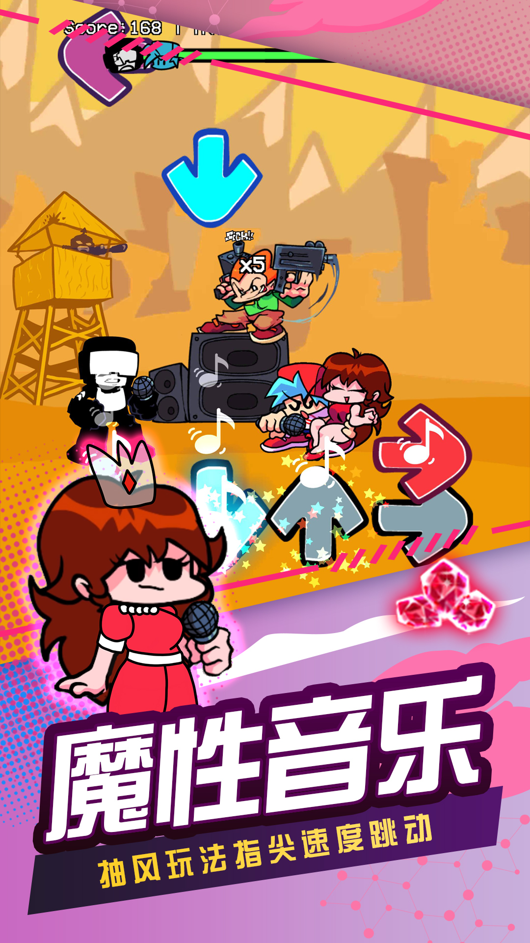 有着经典美式卡通画风、节奏感十足的音乐节奏类休闲游戏。超多的卡通角色,魔性的音乐玩法,跟随按键你要操控角色进行歌唱,累积分数看谁更加厉害,超多类型的歌曲切换,轻松上手的玩法,解锁更多的恶魔角色,参加这场音乐盛宴之中,无比的兴奋。