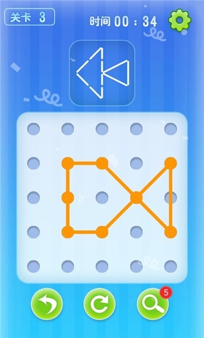《点线交叉》是一款极具创意的解谜类游戏。游戏由三部分组成,第一是参照图,第二是目标图,第三是空白圆点。游戏在一开始会给出一个参照图形,玩家需要将线段拉到空白圆点处,进行固定,使最后固定的形状是给出的参照图,那么游戏闯关成功。但是玩家需要注意的是,可以拉动的是线段,不是线段两端的端点,线段两端的端点是固定的,无法进行移动;并且线段与线段之间不能重合也不能相交,假设出现线段相交或者端点重合的情况,游戏会给出错误提示,表示该步骤错误,玩家需要重新规划。游戏中,玩家需要仔细观察参照图,将目标图与参照图进行分析,才能在最短的时间内,完成目标,取得更好的成绩。游戏没有时间的限制,但是会有计时功能,游戏会记录每关挑战成功的时间。玩家一定要注意,目标图形和下方操作区域的图形是一比一对应的,玩家拼成的图形在位置上也要与目标图形相对应,如果位置有偏差,就无法完成挑战,需要玩家重新游戏。由于游戏是连续性的,因此,若是这一关过不了,则开启不了下一关。