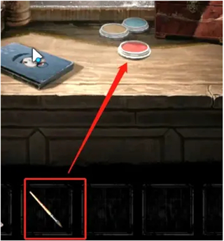 8、返回化妆间,化妆笔点击桌子上的颜料,然后点门,完成一笔勾销小游戏即可打开门(下方路线图,先红后蓝照着画就可以了);